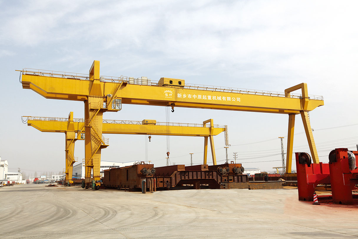 它的金屬結(jié)構(gòu)像門(mén)形框架,承載主梁下安裝兩條支腳,可以直接在地面的軌道上行走,主梁兩端可以具有外伸懸臂梁。